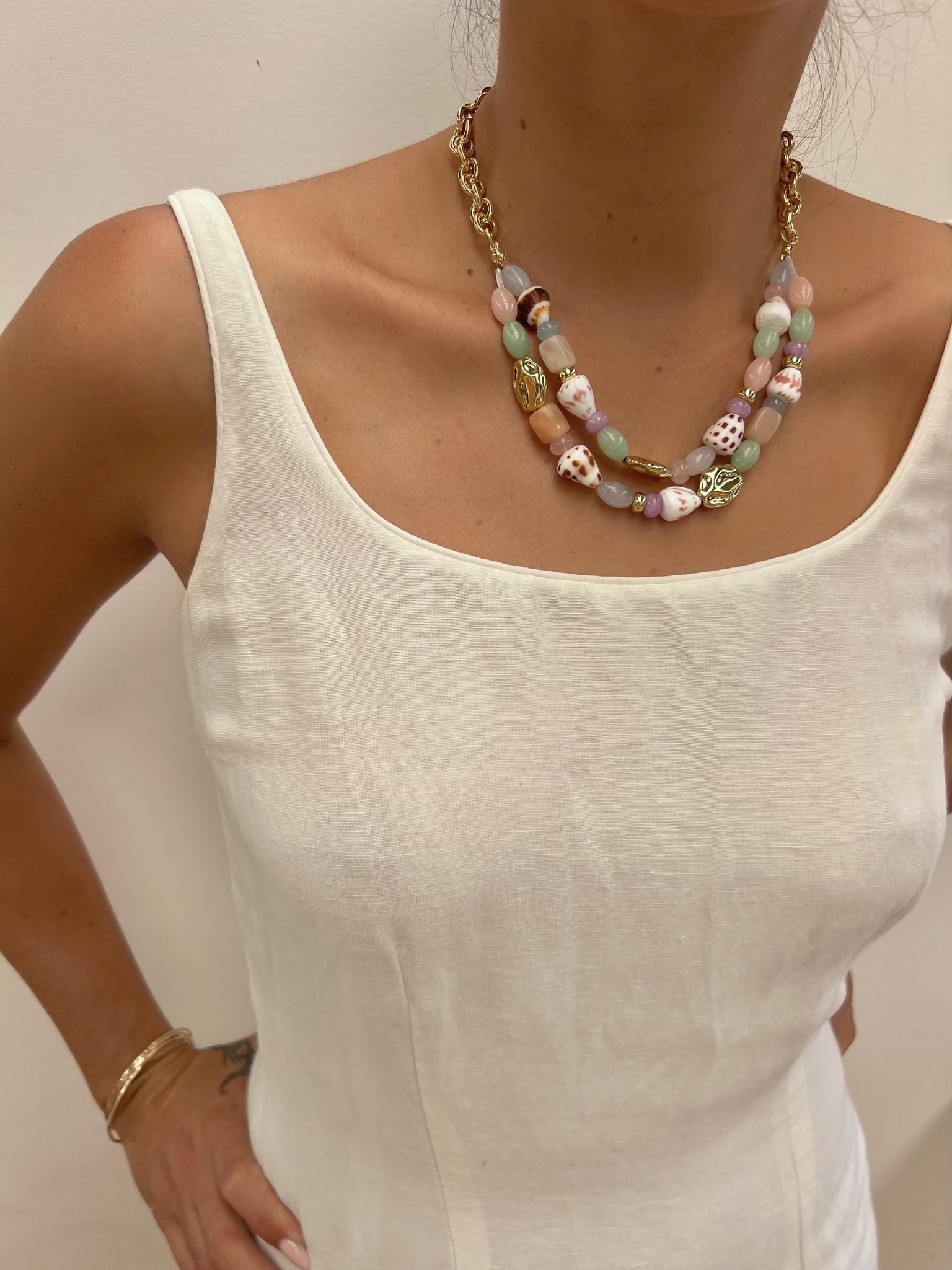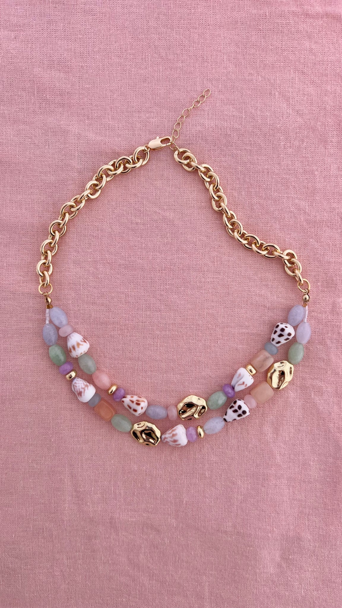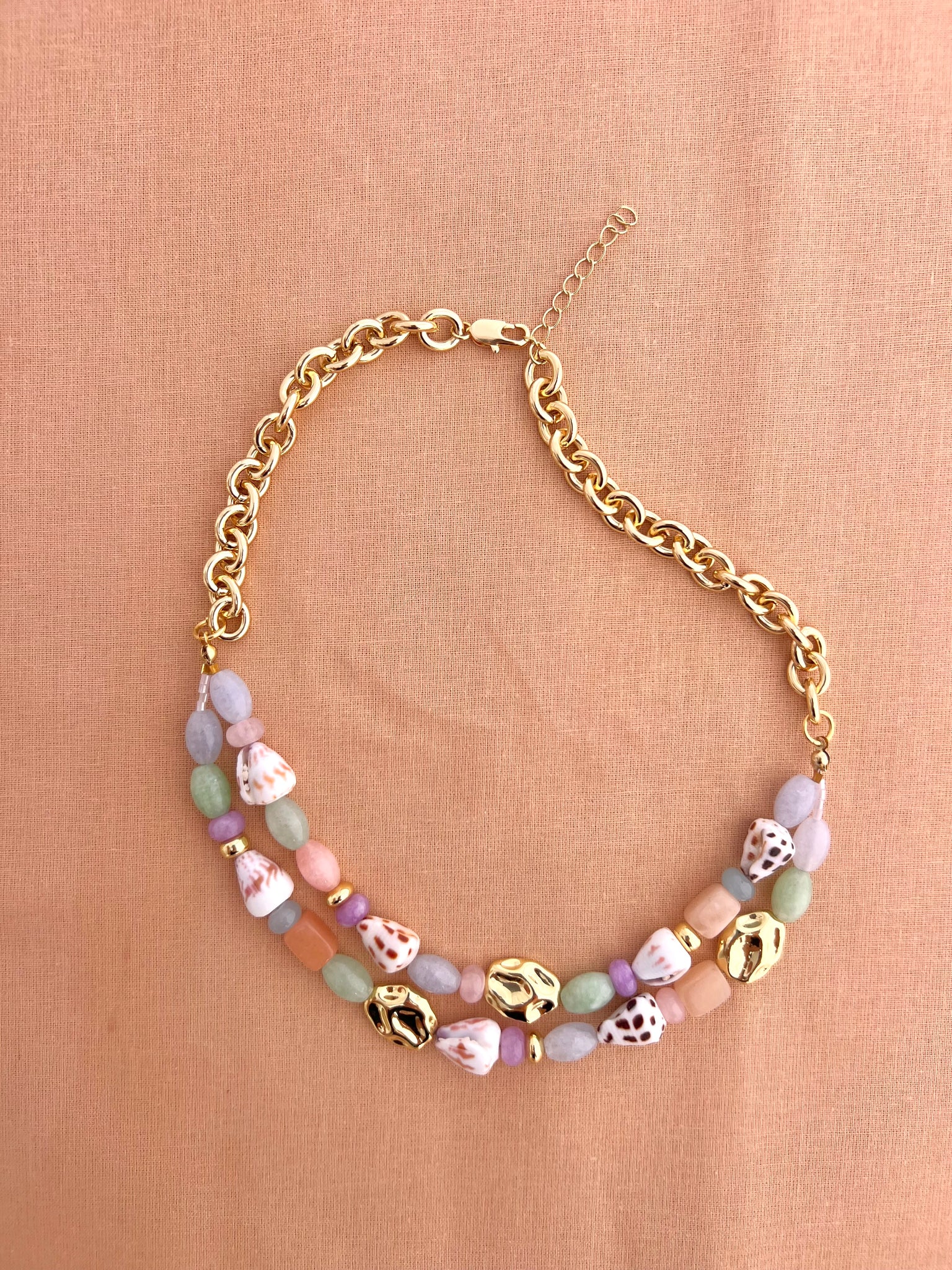 Necklace made with handpicked Hebrew Cone shells, semi precious stones, gold plated metal beads and chains. If SOLD OUT please contact me by messenger or Insta.