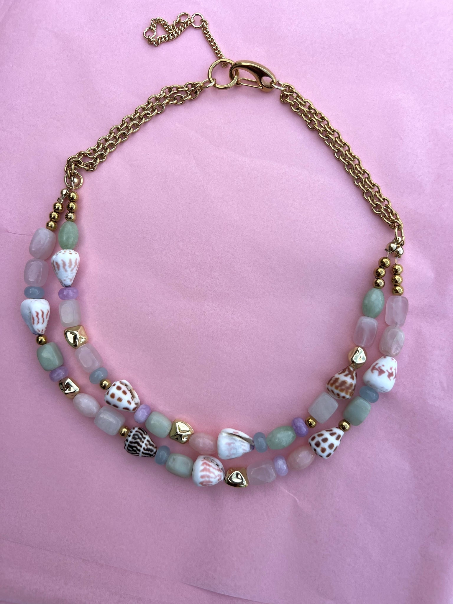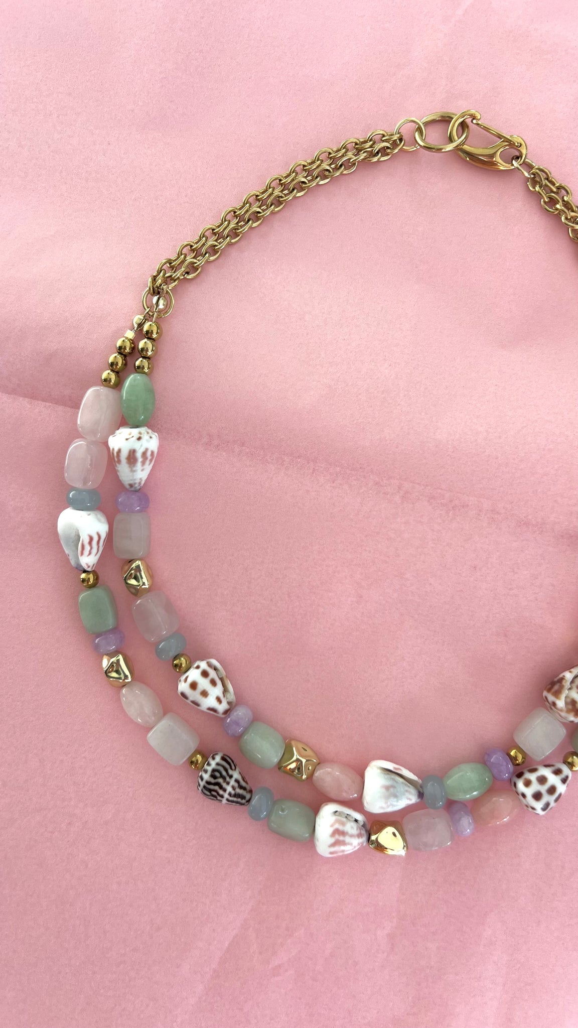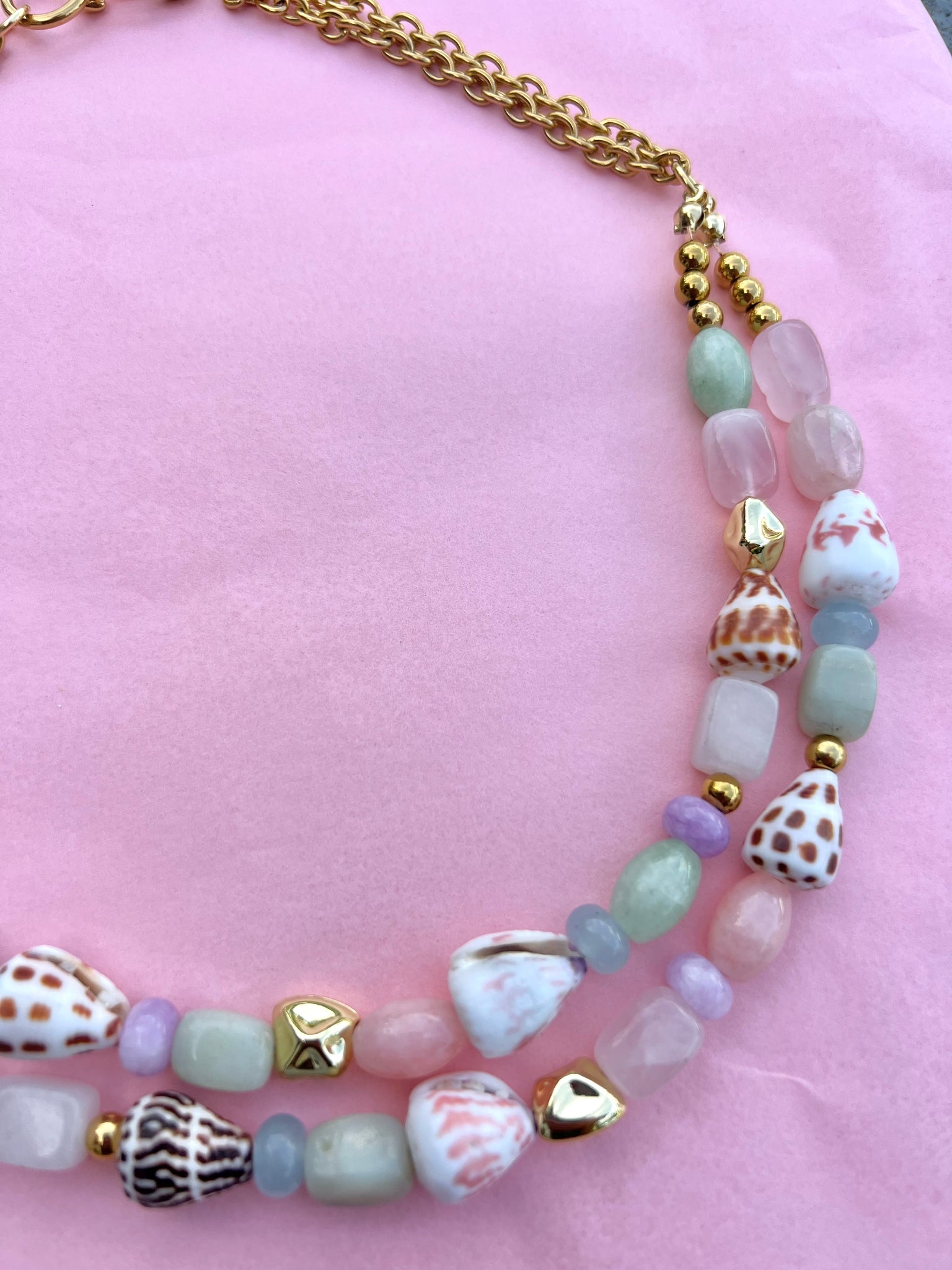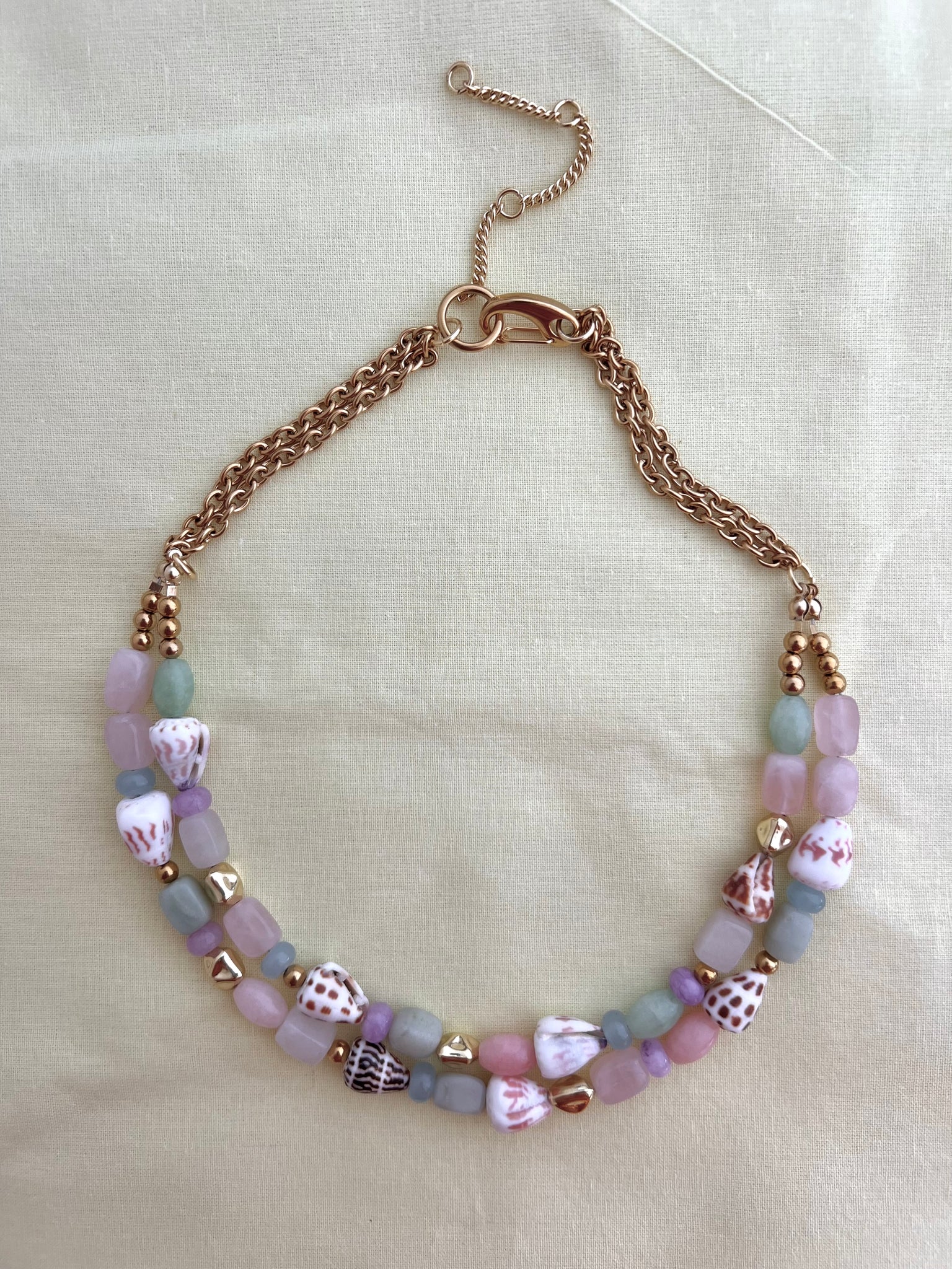 Necklace made with handpicked Hebrew Cone shells, semi precious stones,  stainless steel gold plated metal beads, chains and clasp.